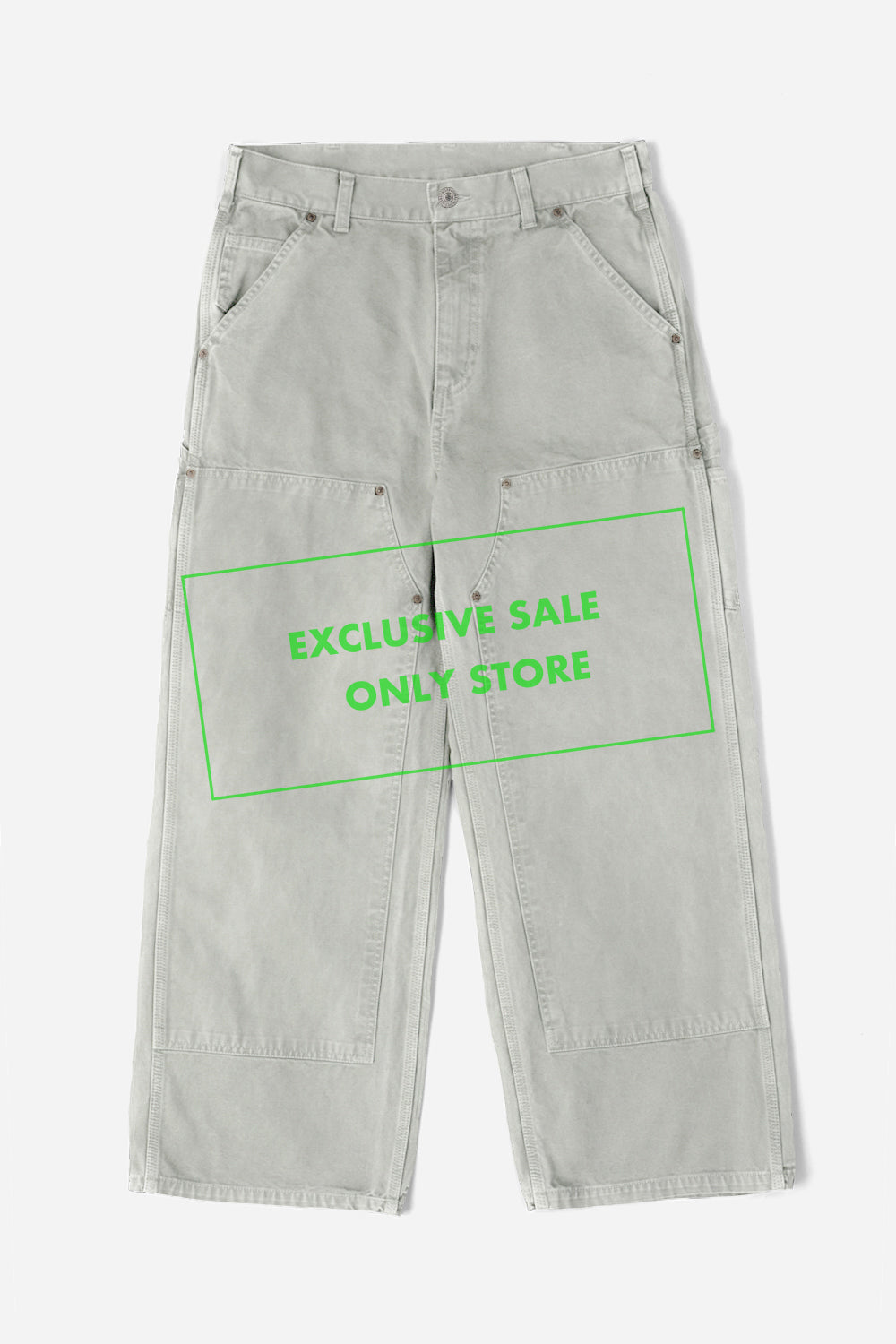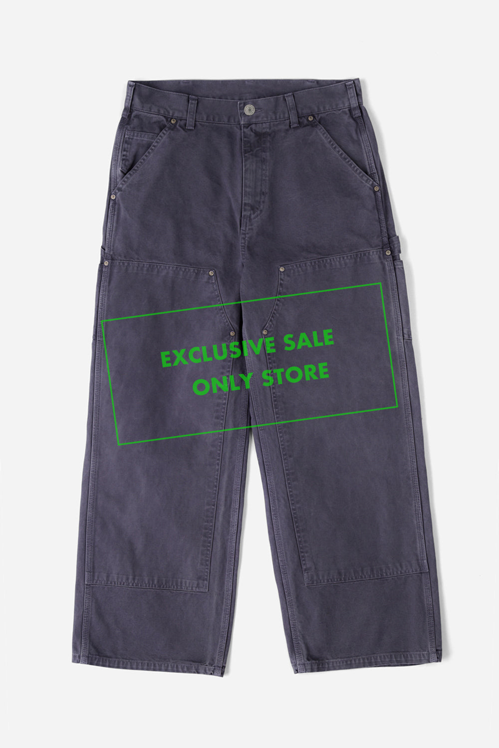 代表的なペインターパンツを参考に、素材やディテールはあまり変えず、ウエスト、ヒップ周りのバランスを修正し、オリジナルにはないワイドレッグに変更。
